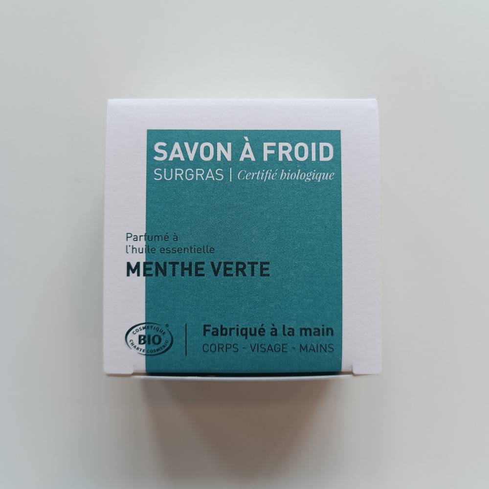 Savon à la menthe verte, saponifié à froid, artisanal, certifié biologique et surgraissé à 9%.