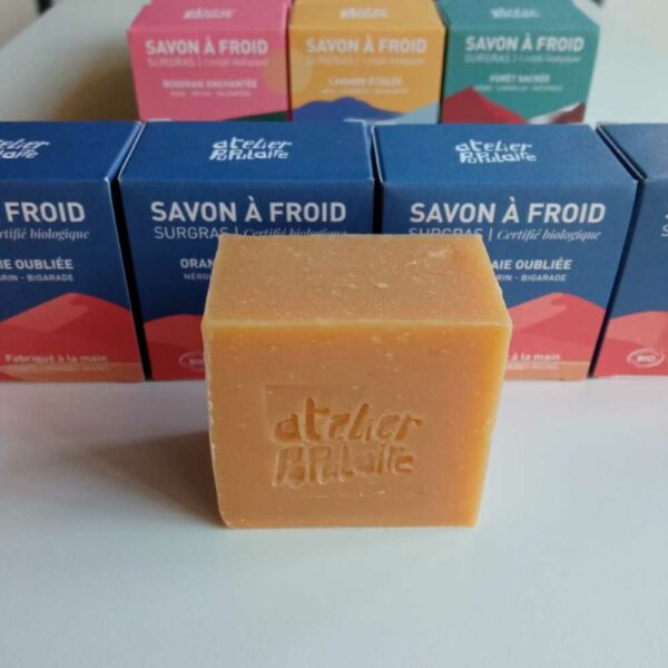 Savon saponifié à froid, artisanal, certifié biologique et surgraissé à 6%. Une fragrance pétillante et gourmande aux notes de fleur d’oranger.