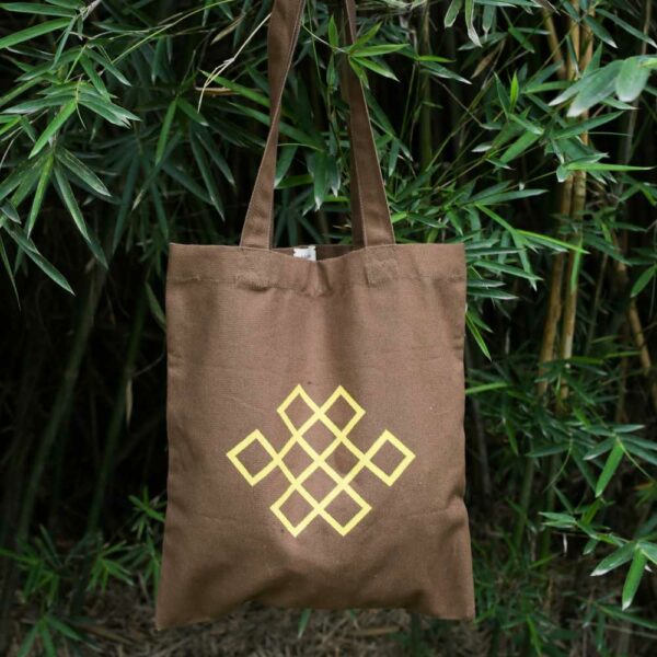 Tote bag brun avec motif nœud bouddhiste jaune sérigraphié, fabriqué à la main par notre partenaire Chhori (anciennement Shanti) au Népal.